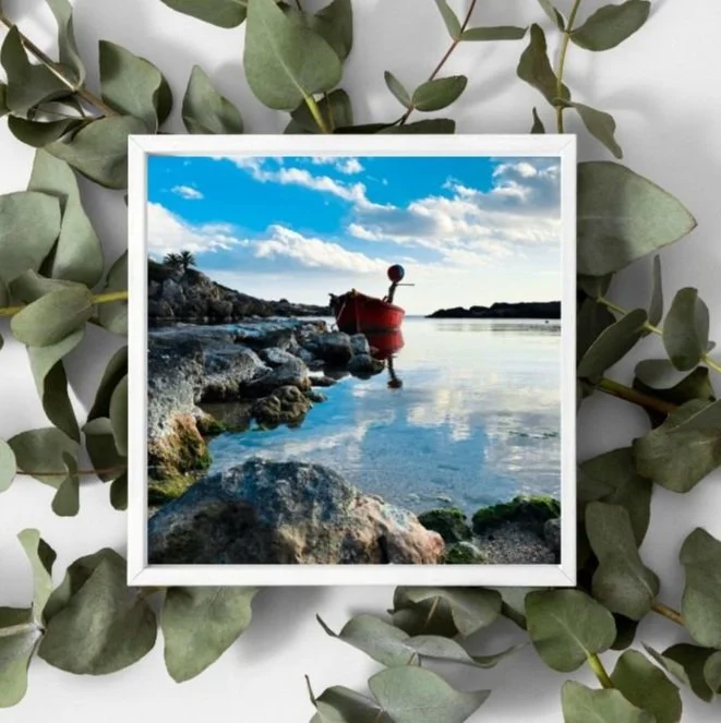 Perfetta per chi ama il mare e i suoi silenzi, questa immagine porta negli interni la magia delle coste mediterranee. È una stampa ideale per arredare case al mare, soggiorni moderni o ambienti in stile naturale, aggiungendo una nota di serenità e colore. La composizione bilanciata e il contrasto tra il rosso brillante della barca e i toni azzurri del cielo trasformano la scena in una poesia visiva.