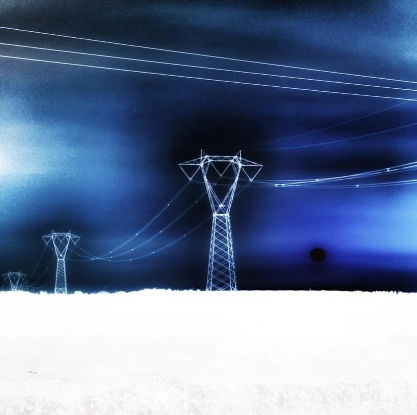 The electric-blue background, together with the luminous white silhouettes of the structures, creates a futuristic and almost metaphysical atmosphere, evoking ideas of connection, tension, technology and flow. The absence of context amplifies the sense of suspension, turning the landscape into an abstract diagram of power — visual and symbolic.