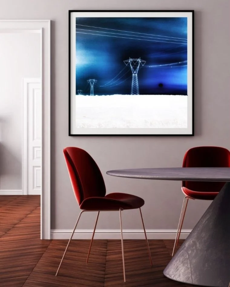 “Links” is a conceptual fine art photograph that reinterprets electrical pylons as sculptural lines of energy suspended in space. Presented in a striking negative style, the image overturns the viewer’s perception of reality: what is normally functional and invisible becomes pure form, rhythm and abstraction.