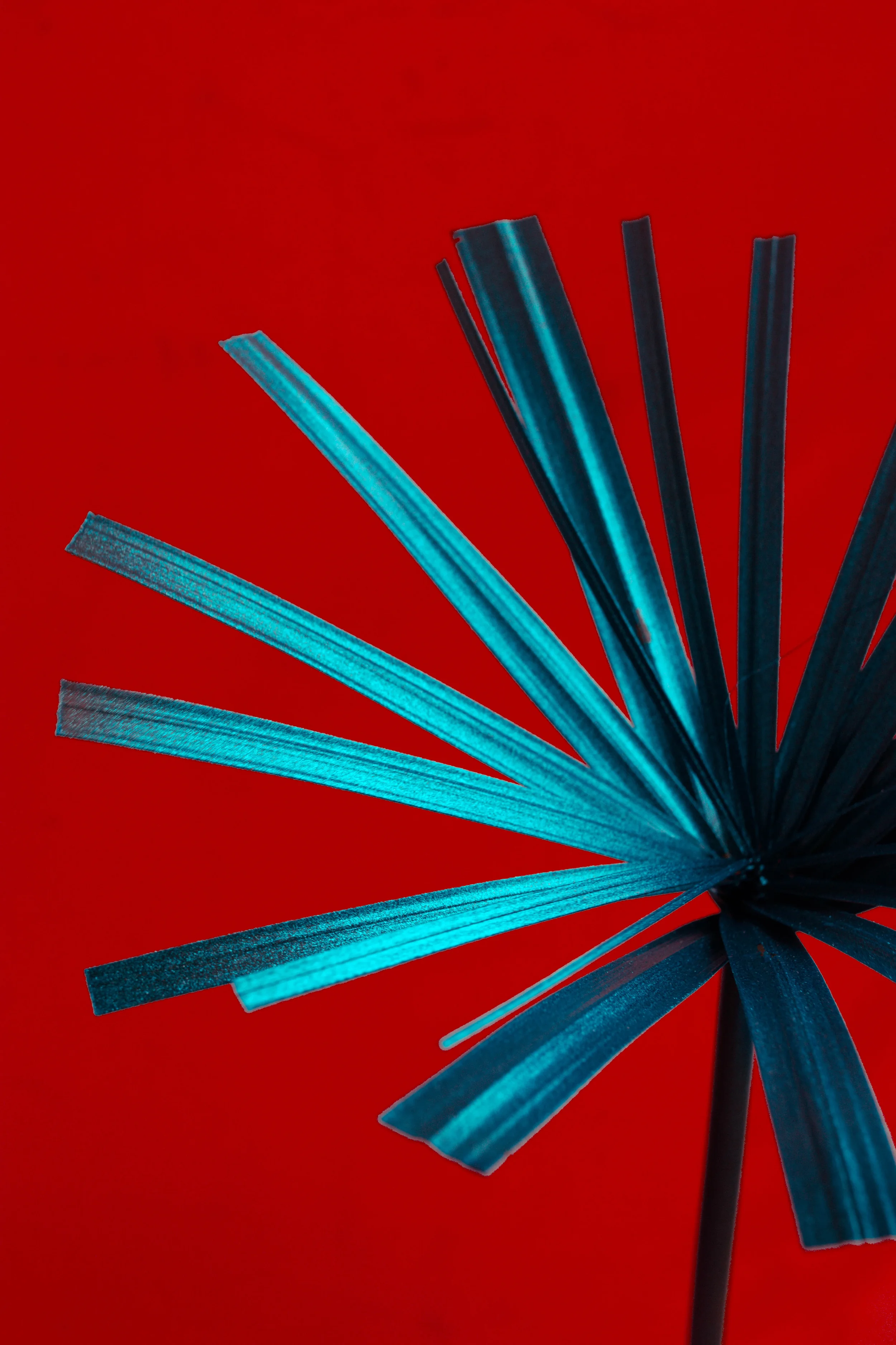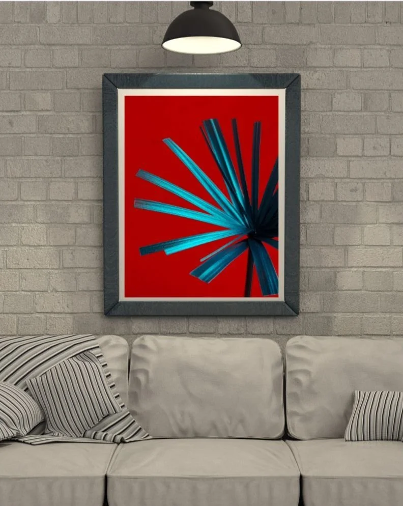 Una fotografia artistica astratta dal forte impatto visivo, che cattura una composizione minimalista in cui una foglia blu ciano si staglia su un vibrante sfondo rosso. La sua estetica pop e il contrasto deciso tra colori complementari creano un effetto dinamico e accattivante, perfetto per amanti del design moderno e degli ambienti creativi.